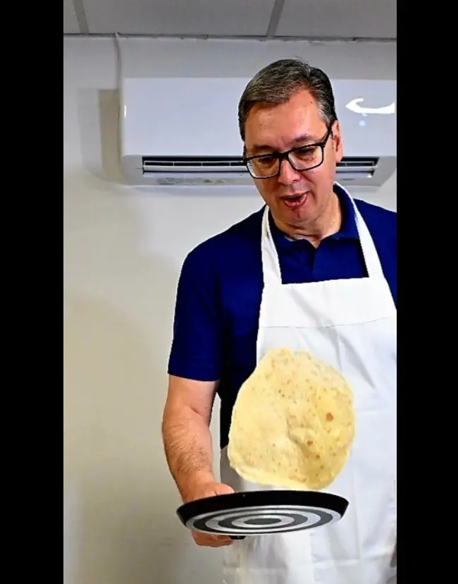 Видеото, публикувано в профила на Вучич в Instagram, показва как президентът приготвя палачинки и ги сервира на войниците.