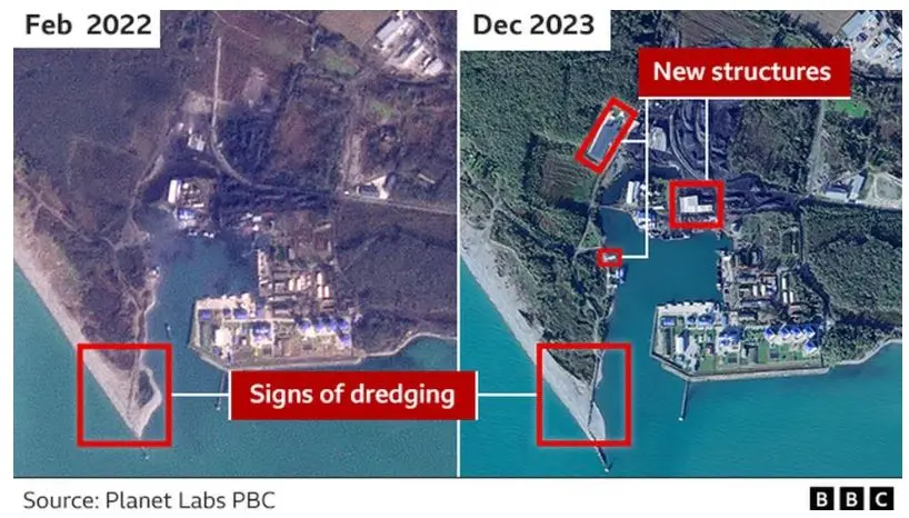 Би Би Си обаче показва сателитни изображения, които доказват нови строителни дейности в пристанището след пълномащабното нахлуване на Русия в Украйна през февруари 2022 г. Според администрацията на Абхазия тази работа означава, че Очамчире вече може да приема по-големи товарни кораби с водоизместимост до 13 000 тона.