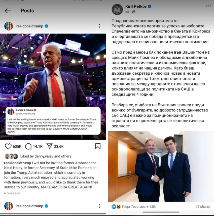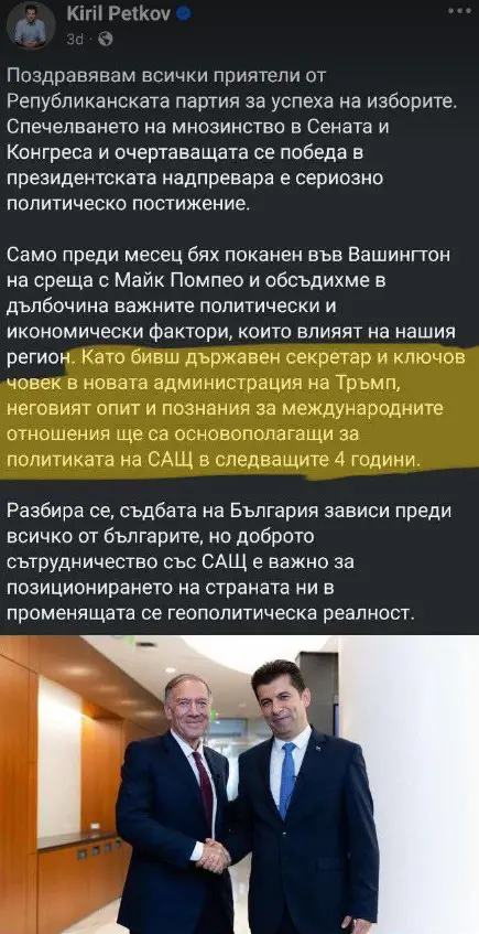 Припомняме, че след победата на Доналд Тръмп, Кирил Петков пусна снимка с Майк Помпео.