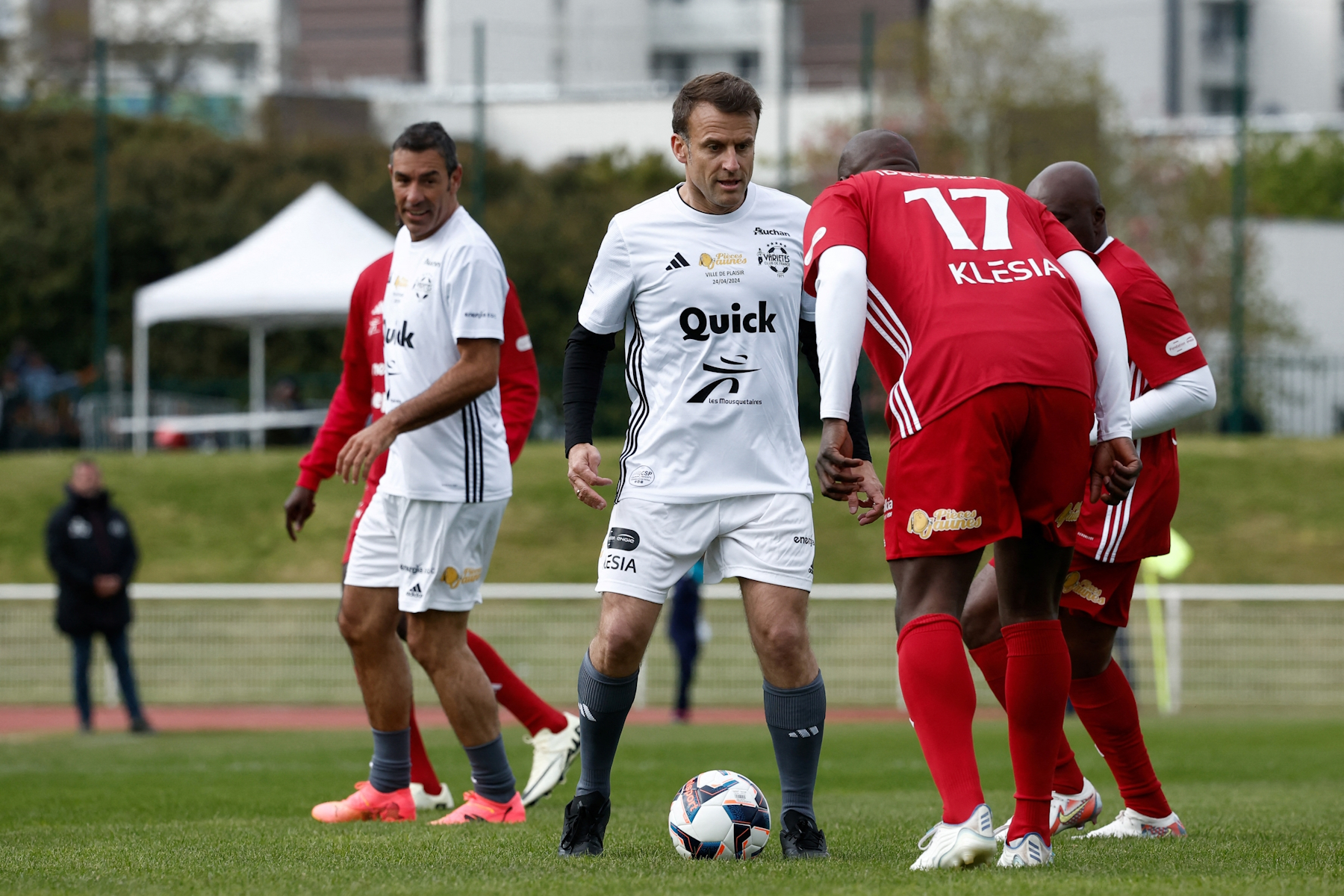 Френският президент Еманюел Макрон отново показа своята спортна натура, пише Индипендънт. Макрон, известен футболен фен, облече фланелка за благотворителен мач заедно с футболни легенди и звездни играчи в клуб в Ивлин, западно от Париж.