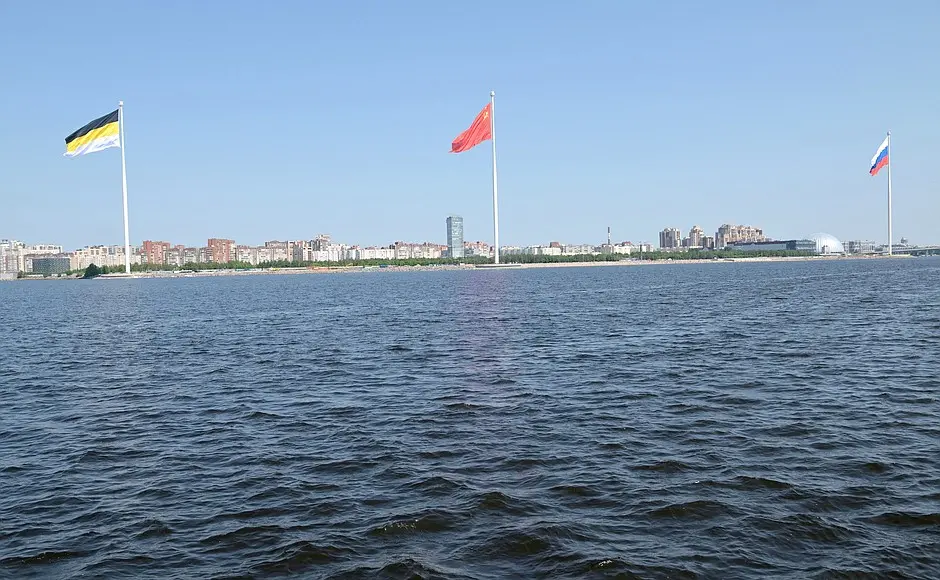 Три пилона от по близо 180 метра със знамена се веят от няколко дни в Санкт Петербург. Те бяха издигнати на брега на морето в близост до Парка на 300-годишнината на Санкт Петербург.