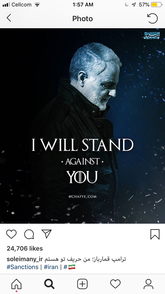 На друг пък е изобразен Висшият командир от Корпуса на гвардейците на Ислямската революция генерал-майор Касем Солеймани с надпис: „Ще ти се противопоставя“.