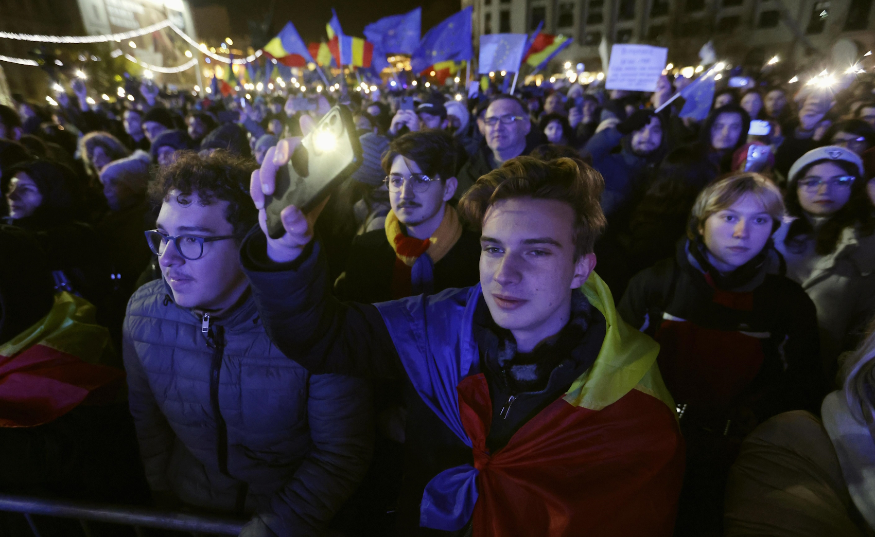 Над 3000 души се събраха вчера вечерта на Университетския площад в центъра на Букурещ, за да се включат в митинг в подкрепа на демокрацията и Европа. Те развяваха знамена на Румъния и Европейския съюз и скандираха "Европа" и "Свобода", "Долу комунизма". Някои носеха и знаме на Румъния с дупка по средата - символ на румънската революция.