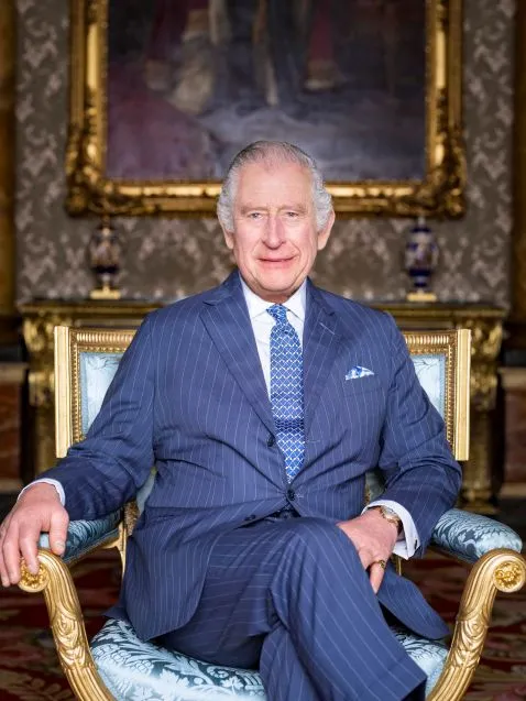 Има и тяхна обща снимка, на която са изправени и позират пред държавен портрет на крал Джордж Пети, който властва от 1910 г. до 1936 г. и е прадядо на Чарлз. Кралицата носи обеци на покойната Елизабет II и колие от личната си колекция.