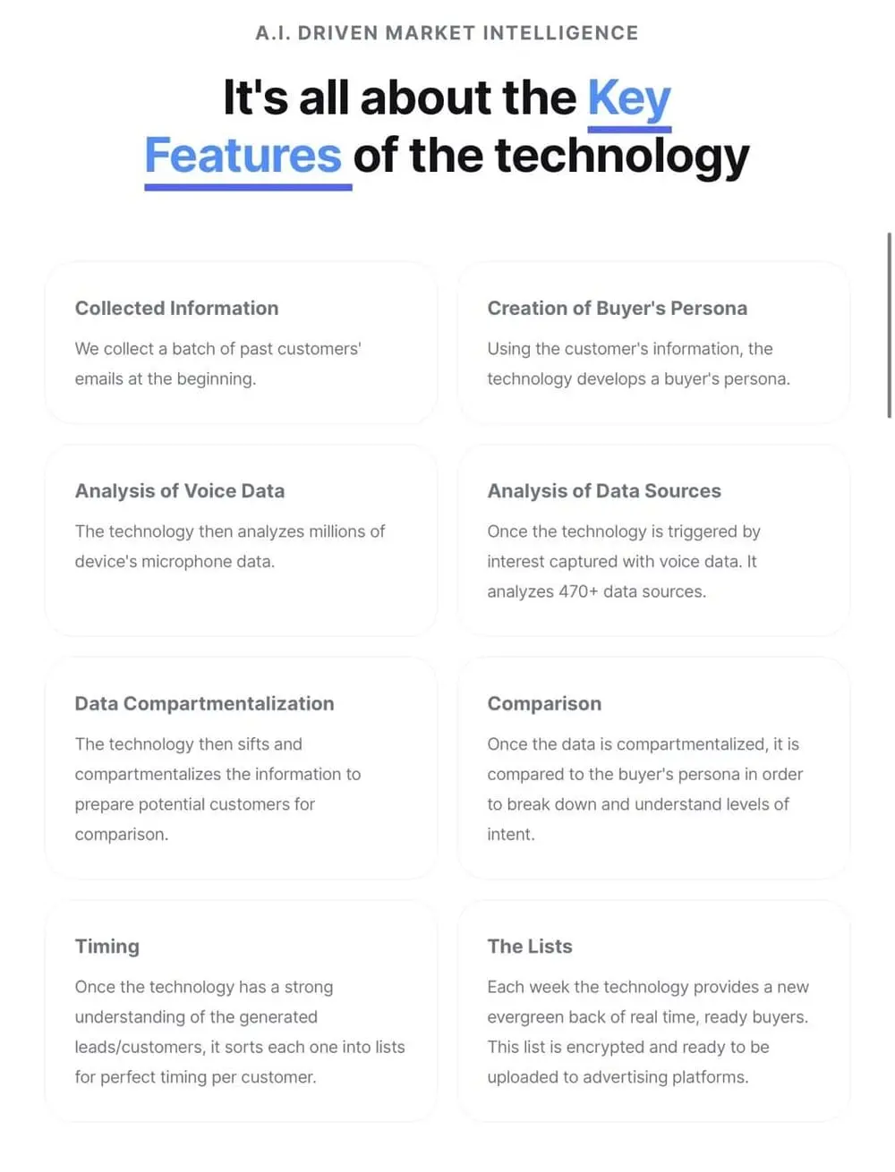 Уебсайтът на MindSift не е особено ясен за това как работи технологията, но се казва, че крайният краен продукт на MindSift е списък с „готови купувачи в реално време“ на база анализирани „милиони данни от микрофони на устройства.“