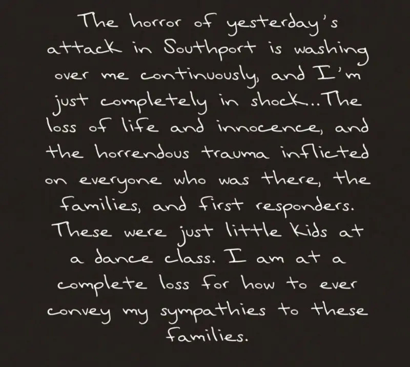 „Ужасът от вчерашното нападение в Саутпорт ме връхлита непрекъснато. Аз съм в пълен шок от загубата на живот и невинност, както и ужасяващата травма, нанесена на всички, които са били там, на семействата и на хората, които са реагирали първи.“