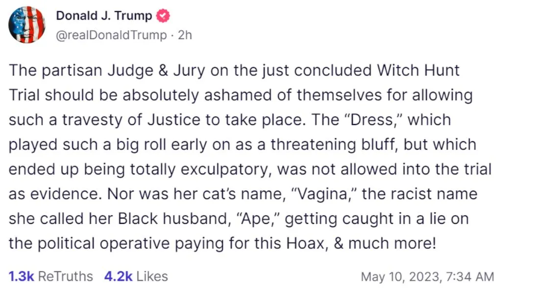 „Пристрастният съдия и съдебните заседатели по току-що приключилия процес за лов на вещици трябва абсолютно да се срамуват от себе си, че са позволили да се случи такава пародия на правосъдието. Нямам абсолютно никаква представа коя е тази жена“, написа още Тръмп в социалната си мрежа.