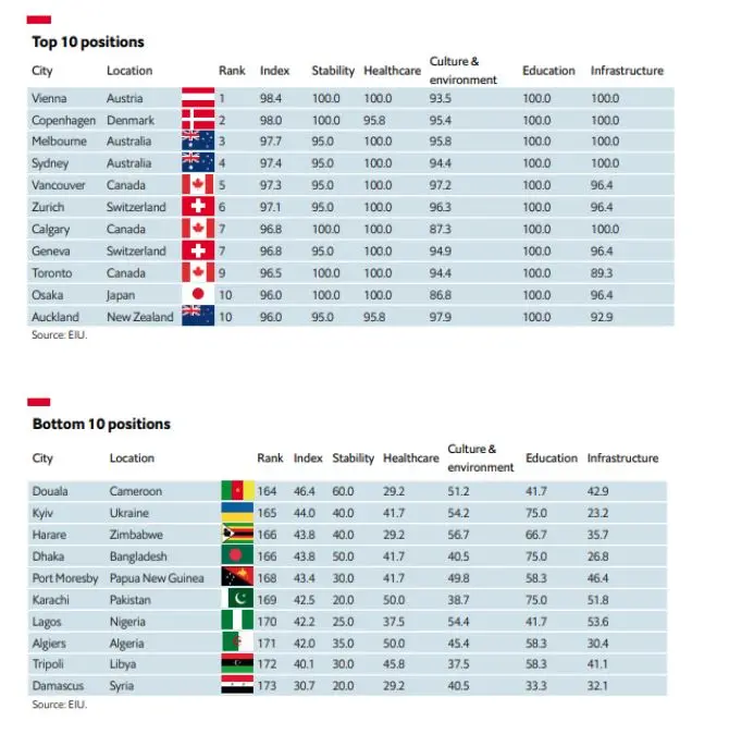 Класацията на градовете се основава на 30 критерия като стабилността, системата на здравеопазване, културата и околната среда, образованието и инфраструктурата. Виена предлага идеална комбинация на петте фактора, се казва в изследването. Единственият недостатък на града е липса на големи спортни събития.