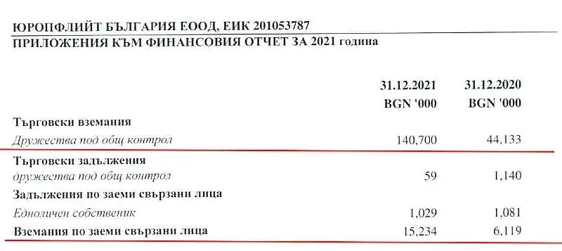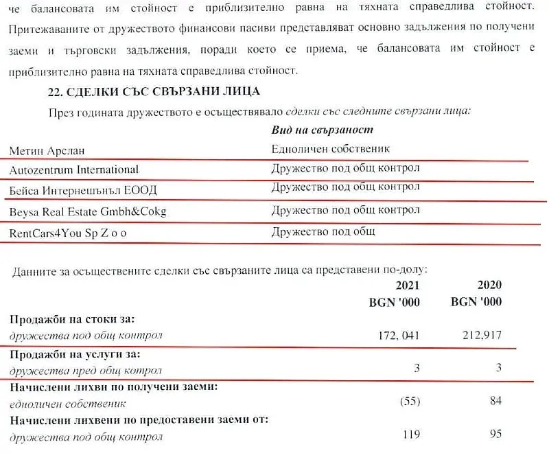 Съвсем символични лихви в заемите между свързаните лица: Докато пазарните нива са между 3% и 5%, свързаните лица тук си предоставят финансиране, като начисляват лихви под 0.1% годишно - неприлично ниско ниво, при което за дълг от 150 млн. лв. калкулираната лихва е едва 119 000 лв. в абсолютна стойност.