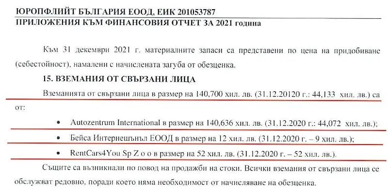 Дали това е разрешено от закона трансферно ценообразуване, което цели да оптимизира данъчните плащания на юридически свързани лица или става въпрос за мащабни злоупотреби, машинации и незаконосъобразни схеми за избягване плащането на данъци, трябва да се произнесат властите, които в момента разследват случая. Ето суровите данни от отчетите на „Юропфлийт България“, които будят подозрението на властите: