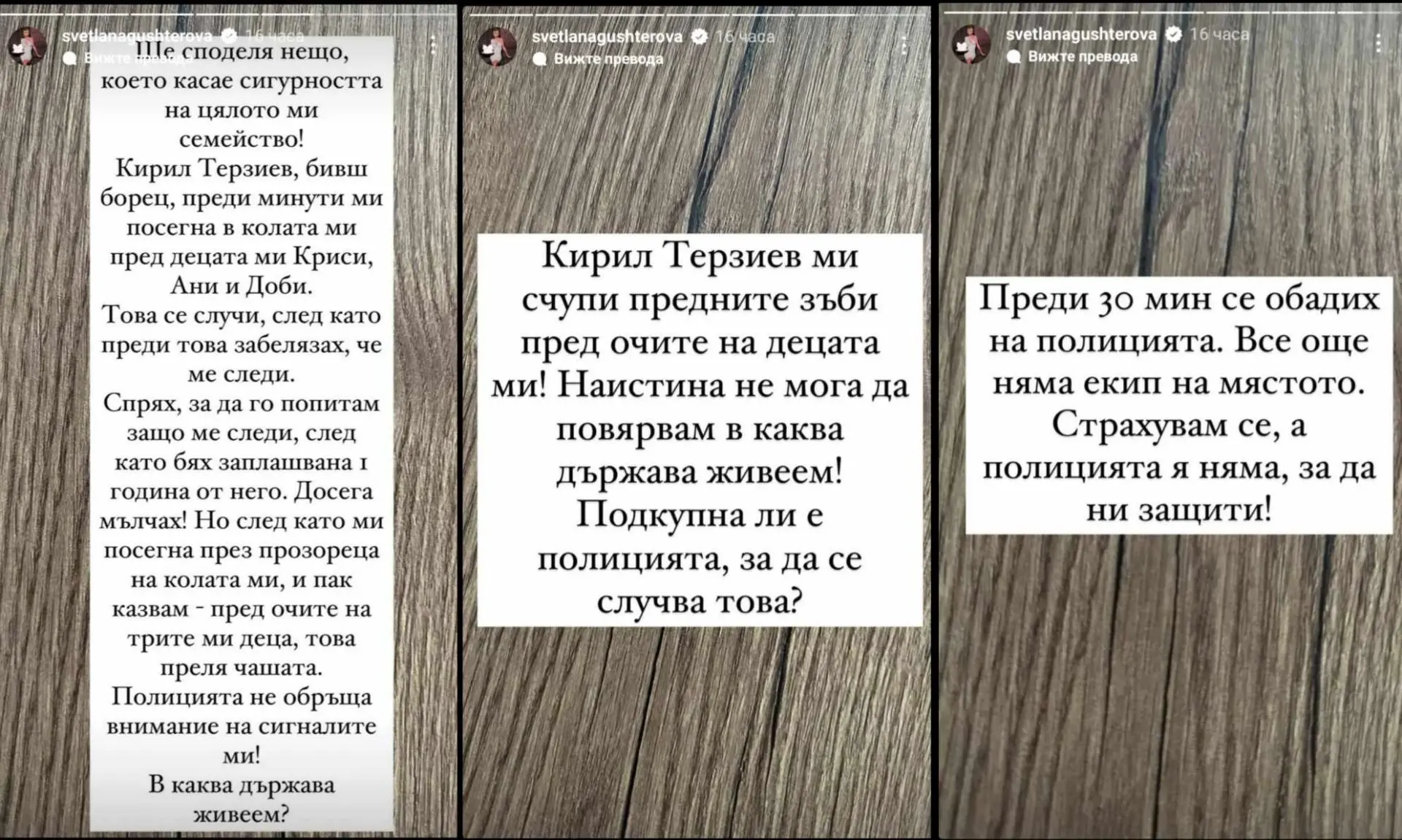 "Кирил Терзиев ми счупи предните зъби пред очите на децата ми!", написа Светлана Василева в Инстаграм. Моделката твърди, че известният борец я пребил в колата й пред очите на три от децата й.