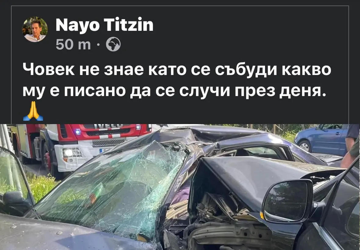 Пиарът на Кирип Петков Найо Тицин също първоначално не спомена жертви и качи снимка от мястото на трагедията, на която колата все още не е отворена и се вижда заклещеното тяло на убития водач.
