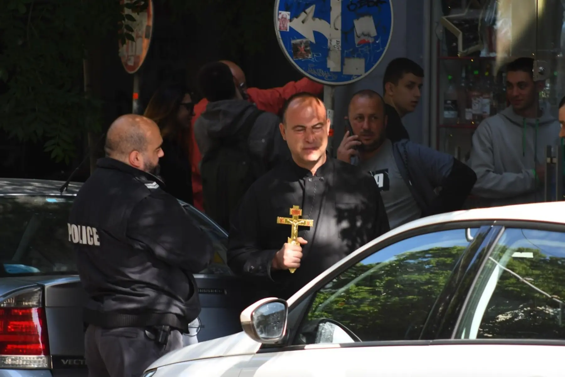 Атанас Стефанов от партия МИР, облечен в черно расо, се опита да нападне физически Кирил Петков по време на протеста в защита на Румен Радев пред Президентството.