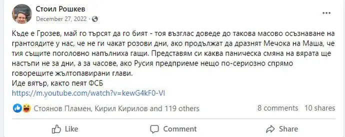 Стоил Рошкев, който протестира в защита на Иван Гешев пред ВСС, е изключително близък до Корнелия Нинова и е в партийната телевизия на БСП от самото й откриване до днес. „Много харесвам Владимир Путин. Би било огромна чест да разговарям с него, защото е силен държавник и върна Русия на подобаващото й място на политическата карта. Този човек свърши много голяма работа“, казва Рошкев в интервю за партийния вестник на БСП „Дума“ през 2019 г. През декември миналата година Рошкев пише във Фейсбук „Къде е Грозев, май го търсят да го бият - тоя възглас доведе до такова масово осъзнаване на грантоядите у нас, че не ги чакат розови дни, ако продължат да дразнят Мечока на Маша, че тия същите поголовно напълниха гащи. Представям си каква паническа смяна на вярата ще настъпи не за дни, а за часове, ако Русия предприеме нещо по-сериозно спрямо говорещите жълтопавирани глави.“ През януари 2023 година Рошкев пише, че Страхил Ангелов е блокиран във Фейсбук заради пост срещу украинската армия. „Нарекох ги военнопрестъпници, а тези които подкрепят и аплодират деянията им фашисти!“, коментира Страхил Ангелов.