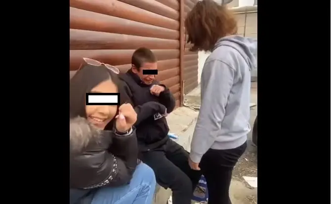 Друго момиче стои отстрани, наблюдава случващото и се смее, а трети човек снима клипа.