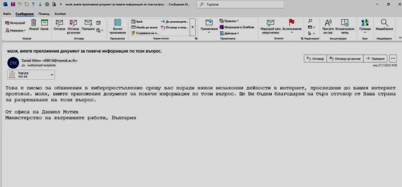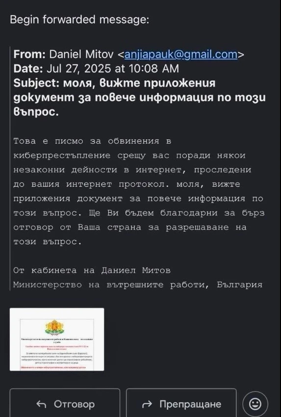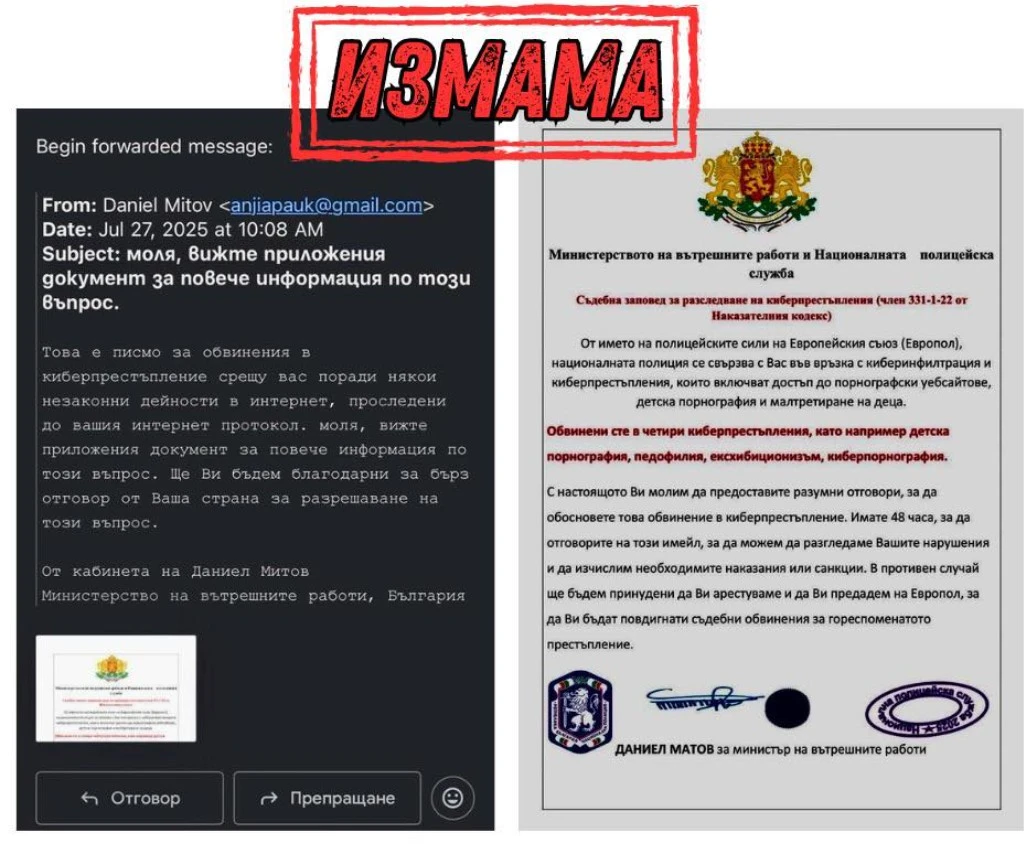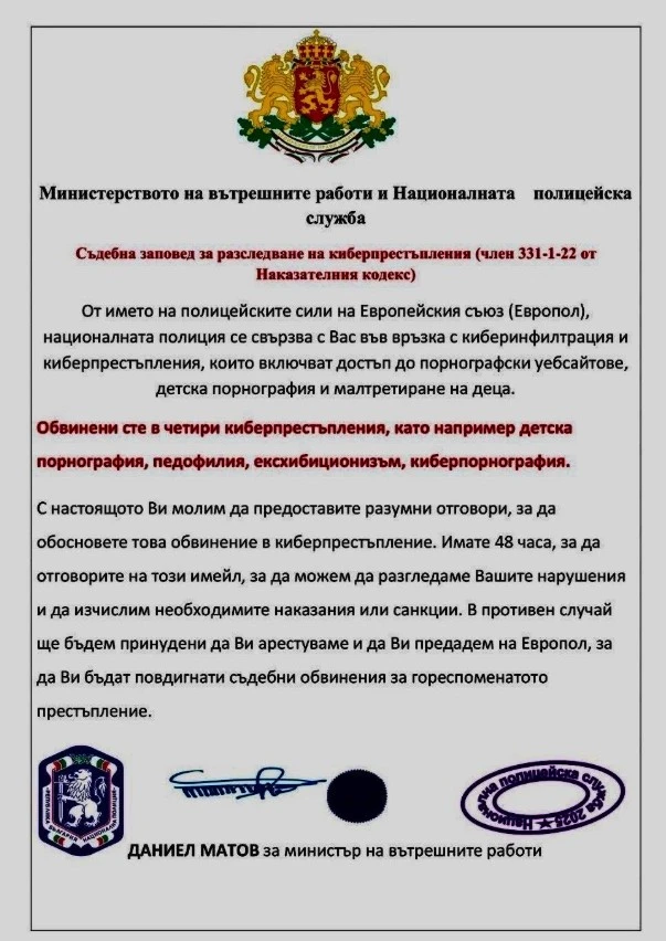 Главна дирекция „Борба с организираната престъпност“ (ГДБОП) сигнализира за нова фишинг атака, при която измамници изпращат имейли от името на Министерството на вътрешните работи. В съобщенията се твърди, че получателят е обвинен в поне четири тежки киберпрестъпления, сред които педофилия и разпространение на детска порнография, и се настоява за „съдействие“ чрез отваряне на прикачен файл.