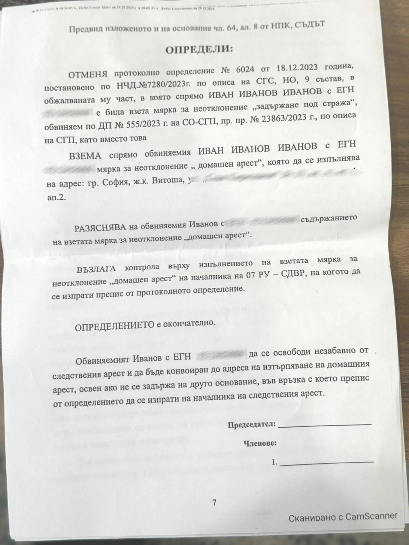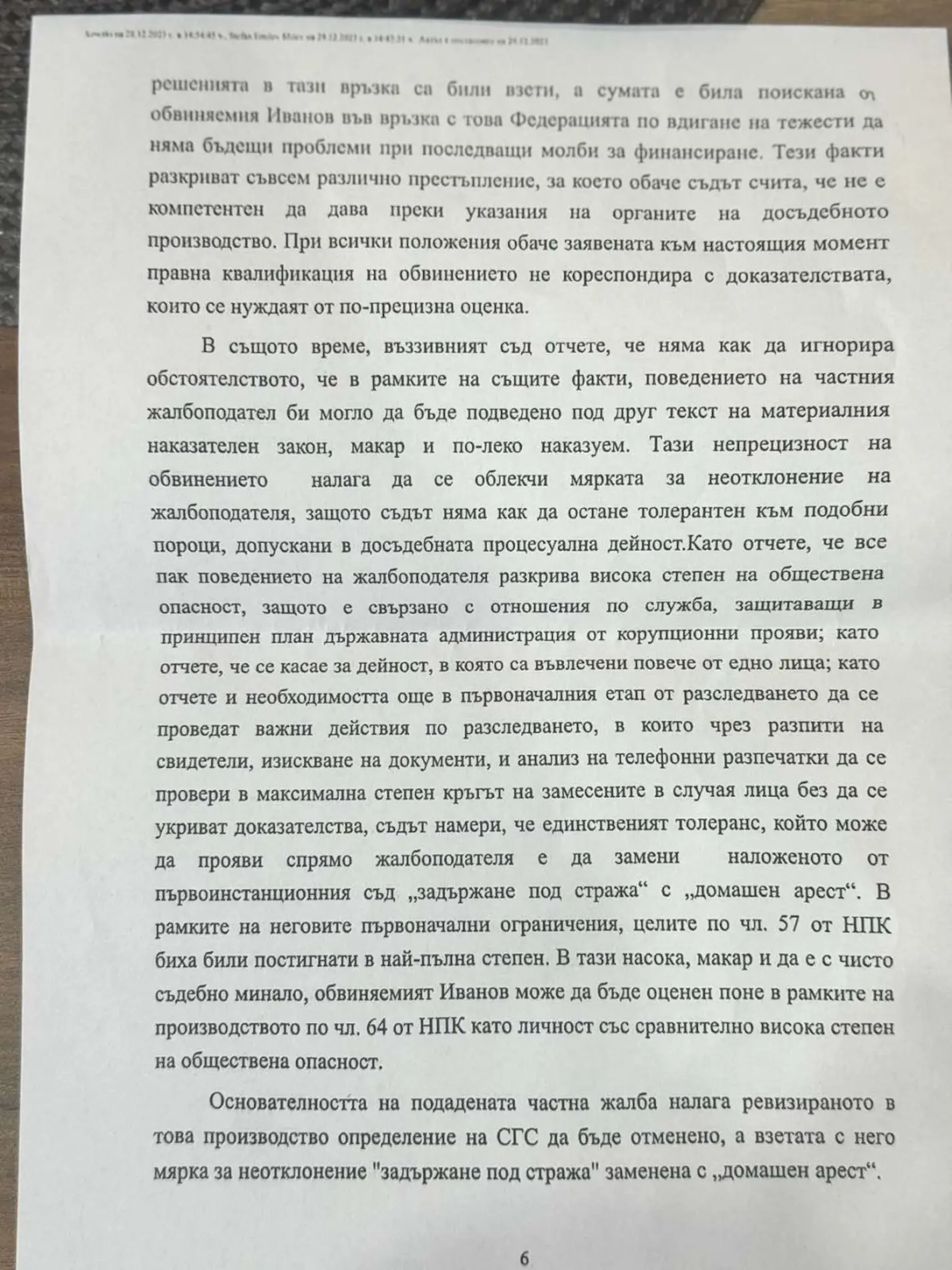 Сайтът Crimesbg.com публикува протокол от мярката, с която синът и съименник на големия щангист Иван Иванов обжалва задържането си под стража. В документа (чиято достоверност не е потвърдена) изрично се посочва името на зам.-министъра на спорта Даниела Дашева като краен получател на сумата.