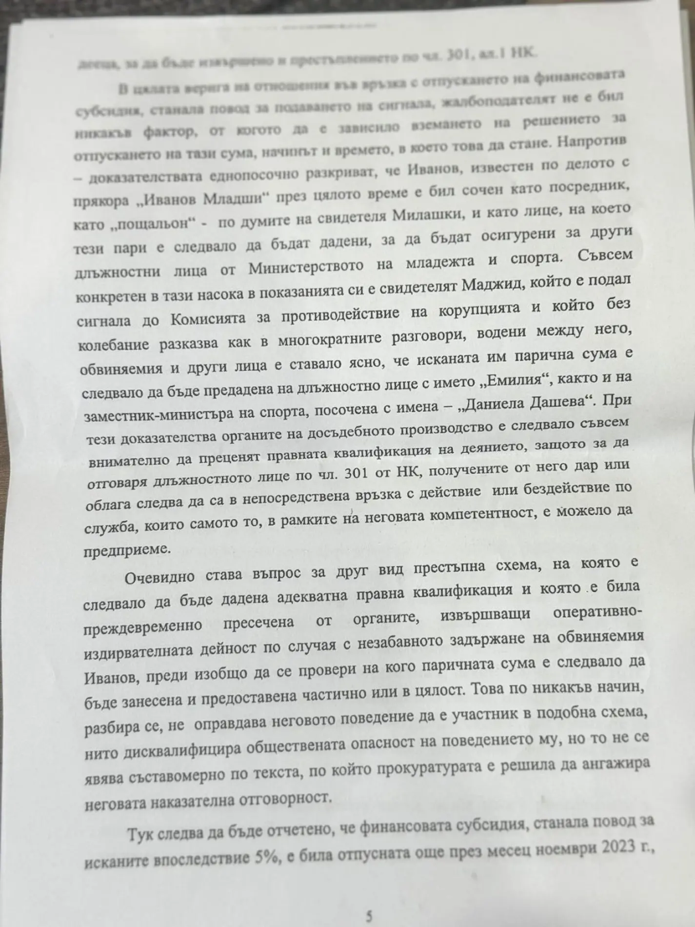 “…..Напротив - доказателствата еднопосочно разкриват, че Иванов, известен по делото с прякора „Иванов Младши“ през цялото времe e бил сочен като посредник, като ,,пощальон“ - по думите на свидетеля Милашки, и като лице, на което тези пари e следвало да бъдат дадени, за да бъдат осигурени за други длъжностни лица от Министерството на младежта и спорта. Съвсем конкретен в тази насока в показанията си е свидетелят Маджид, който е подал сигнала дo Комисията за противодействие на корупцията и който без колебание разказва как в многократните разговори водени между него, обвиняемия и други лица, е ставало ясно, че исканата им парична сума е следвало да бъде предадена на длъжностно лице с името ,,Емилия“, както и на зам.-министъра на спорта, посочена с имена - “Даниела Дашева”, е записано още в официалния документ от разпита.