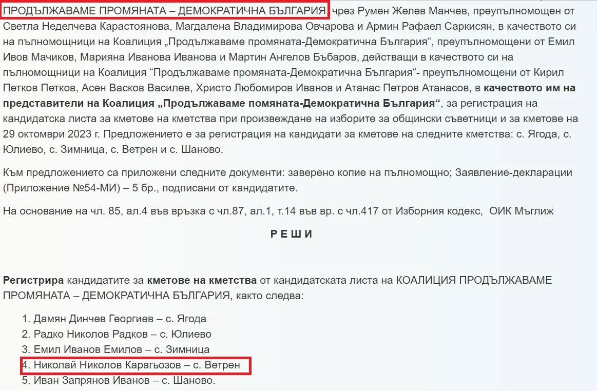 Кандидат-кметът на ПП Николай Карагьозов е обвинен в жесток побой над съпругата си. Ужасяващото нападение се случило едва преди няколко дни. Прибирайки се от рожден ден, Карагьозов се нахвърля с жестоки юмруци върху спящата си съпруга, нанасяйки ударите в горната част на тялото. Освен физическия ужас, който изживявала жената, тя трябвало да търпи и обидите на Карагьозов, който докато я удрял я заплашвал с убийство. „Ти си нищожество, ти си нищо, боклук“, крещял кметът на село Ветрен докато нанасял удари на съпругата си.