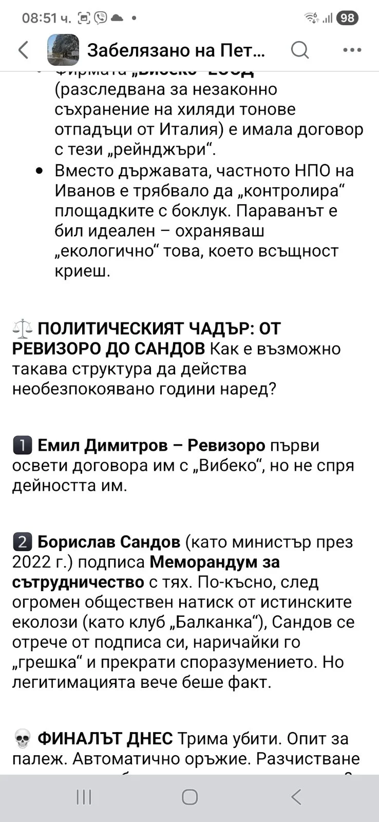ВРЪЗКАТА С „ИТАЛИАНСКИЯ БОКЛУК“ (СЛУЧАЯТ ВИБЕКО) Основателят на сдружението, Ивайло Иванов, не е случаен. Още през 2020 г. в Парламента гръмна скандал: Фирмата „Вибеко“ ЕООД (разследвана за незаконно съхранение на хиляди тонове отпадъци от Италия) е имала договор с тези „рейнджъри“. Вместо държавата, частното НПО на Иванов е трябвало да „контролира“ площадките с боклук. Параванът е бил идеален – охраняваш „екологично“ това, което всъщност криеш. ⚖️ ПОЛИТИЧЕСКИЯТ ЧАДЪР: ОТ РЕВИЗОРО ДО САНДОВ Как е възможно такава структура да действа необезпокоявано години наред?