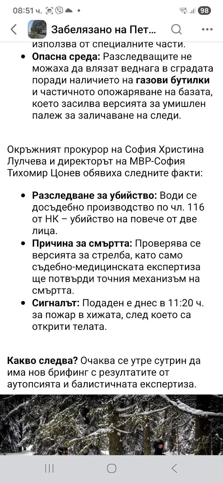 Разследване за убийство: Води се досъдебно производство по чл. 116 от НК – убийство на повече от две лица. Причина за смъртта: Проверява се версията за стрелба, като само съдебно-медицинската експертиза ще потвърди точния механизъм на смъртта.