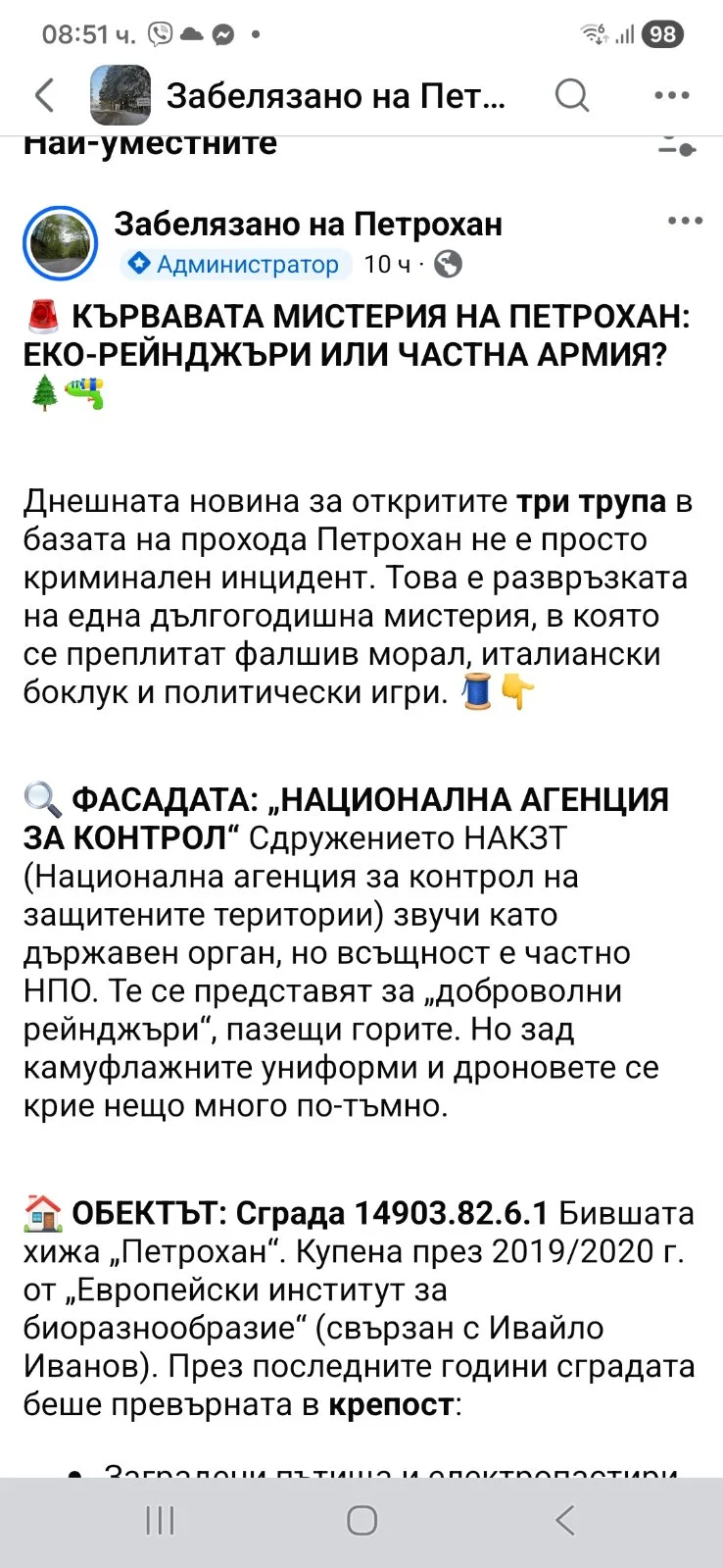 ОБЕКТЪТ: Сграда 14903.82.6.1 Бившата хижа „Петрохан“. Купена през 2019/2020 г. от „Европейски институт за биоразнообразие“ (свързан с Ивайло Иванов). През последните години сградата беше превърната в крепост: Заградени пътища и електропастири. Денонощно въоръжено наблюдение. Ограничен достъп за туристи и местни. Днес при огледа там са открити автомати „Калашников“ и тежко въоръжение. ????????