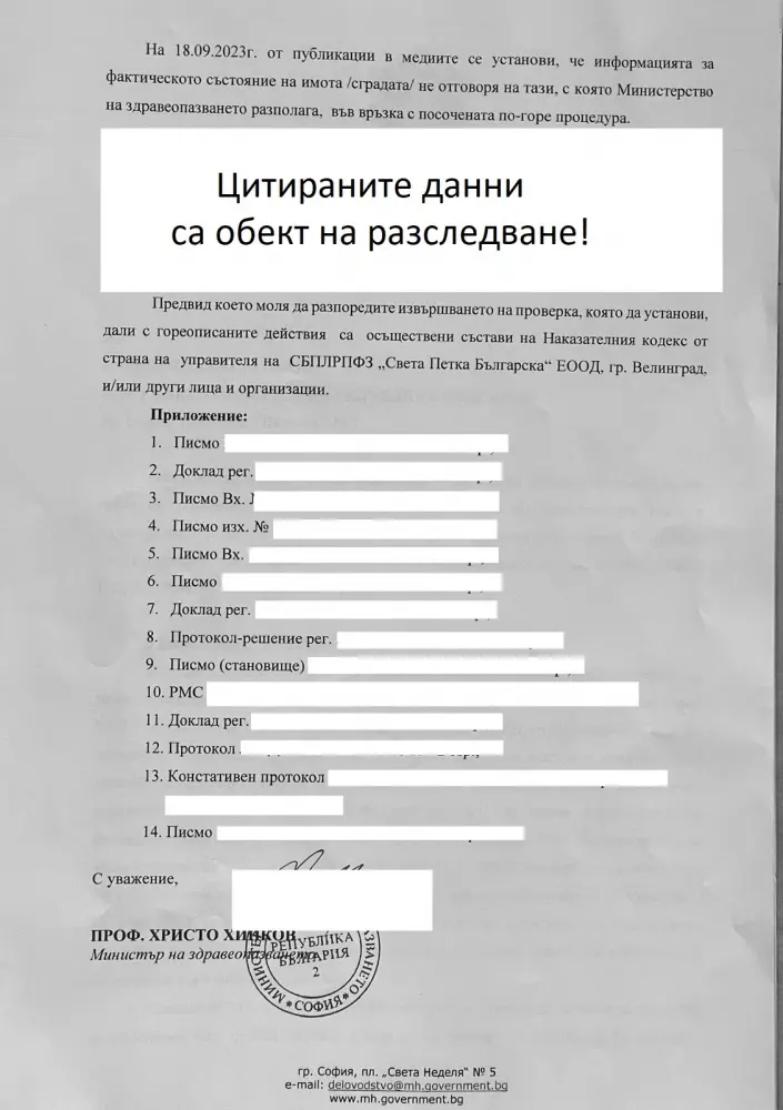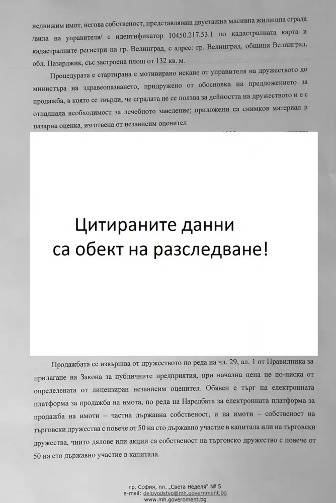 Министерството на здравеопазването сезира прокуратурата за случая с продажба на недвижим имот на двуетажна масивна сграда /Вила на управителя/, собственост на „Специализирана болница за продължително лечение и рехабилитация на пневмофтизиатрични заболявания „Света Петка Българска” ЕООД, гр. Велинград. Това съобщиха от пресцентъра на здравното министерство.