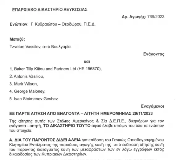„През 2023 г. заведох дело в Република Кипър срещу едно юридическо и четири физически лица на основание „заговор с цел измама“ (conspiracy to defraud) – „Бейкър Тили-Кипър“, Антониос Василиу, Марк Уилсън, Джордж Малоуни и бившия вече главен прокурор на България Иван Стоименов Гешев. На заседание през декември миналата година кипърският съд реши, че има юрисдикция да разгледа делото по същество, тъй като предполагаемата измама е извършена на територията на Република Кипър, както и че има достатъчно доказателства за обосновано предположение за „заговор с цел измама“, пише още Цветан Василев.