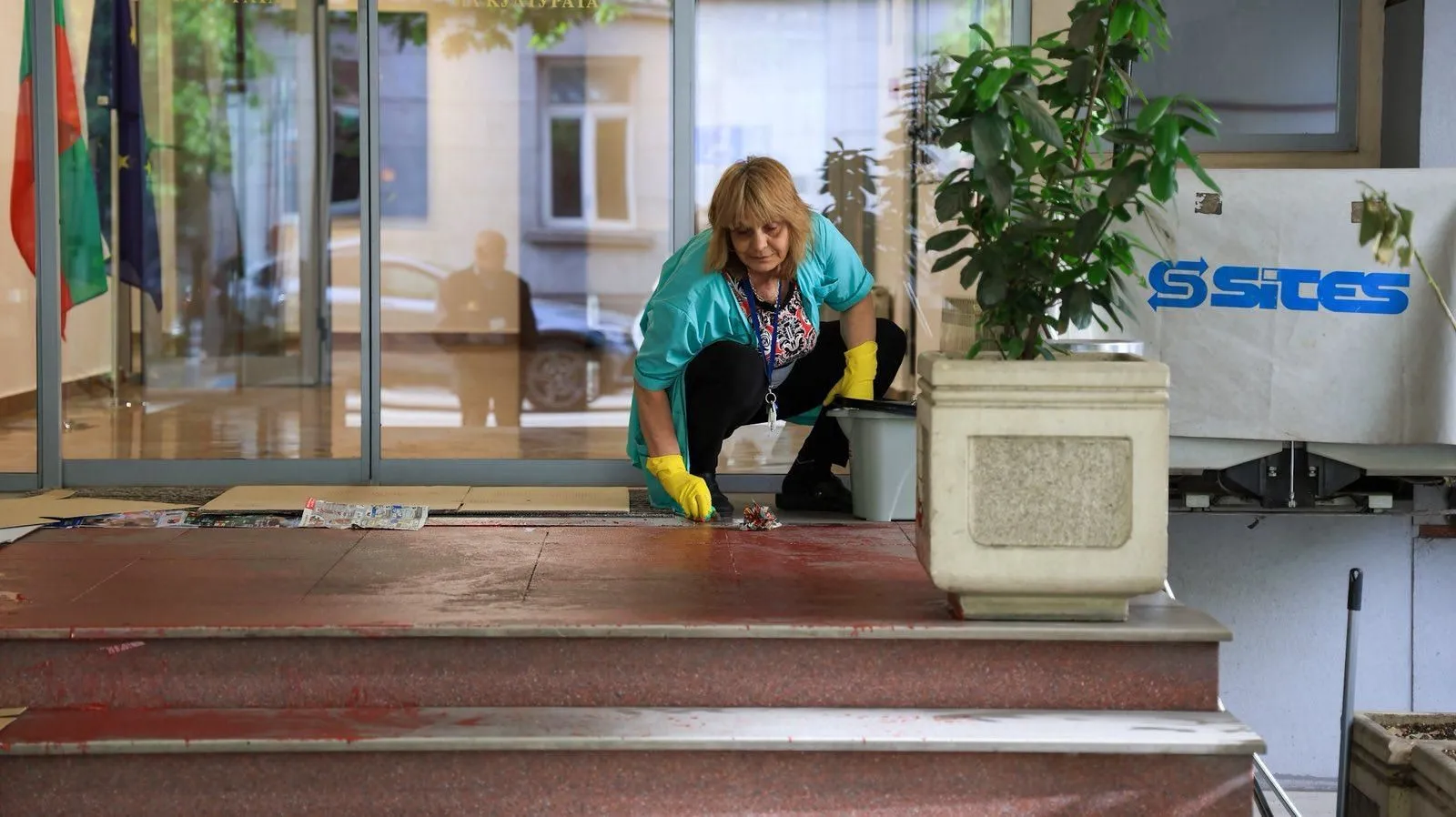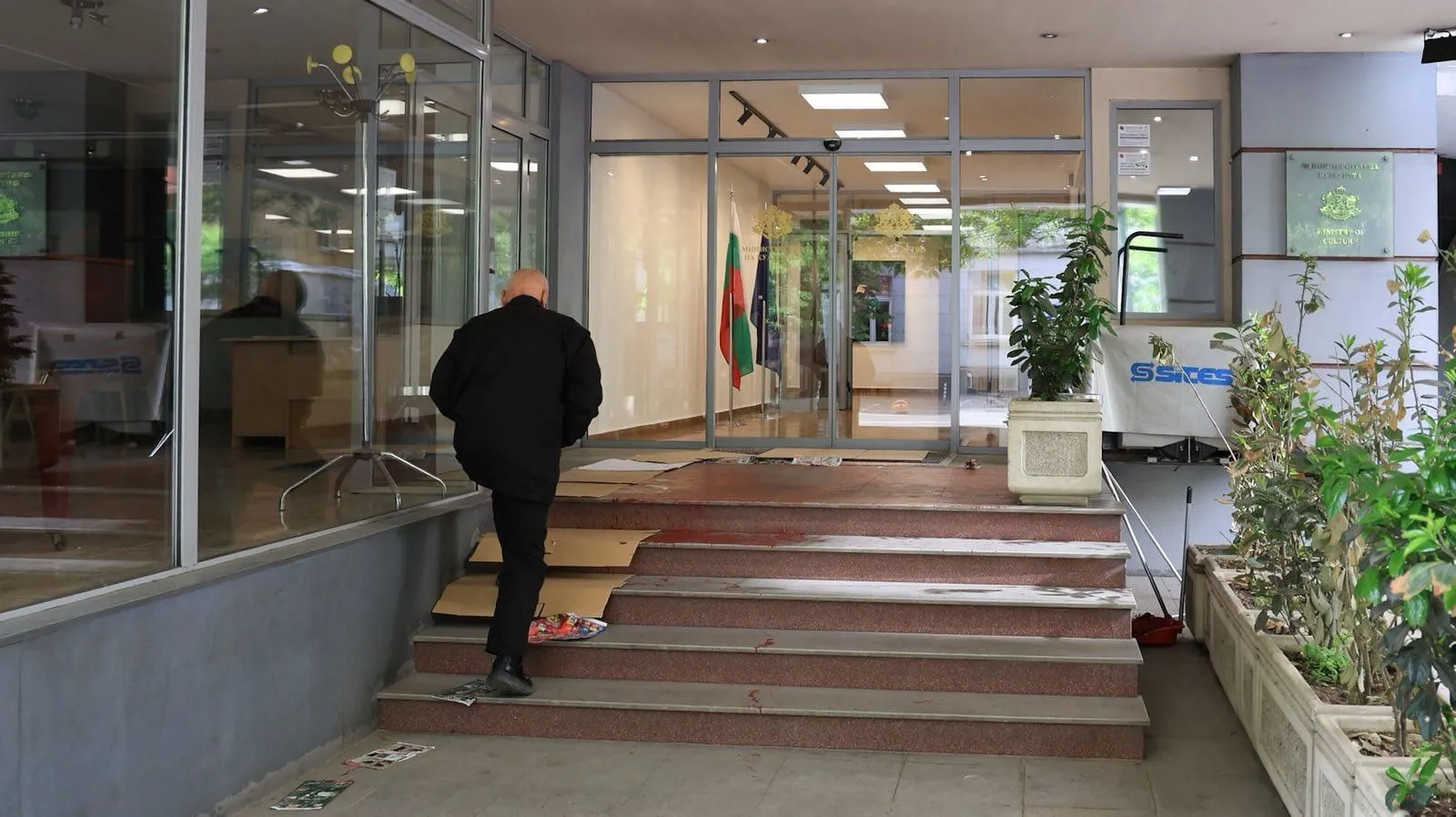 Мъж заля с червена боя входа на Министерство на културата в София.