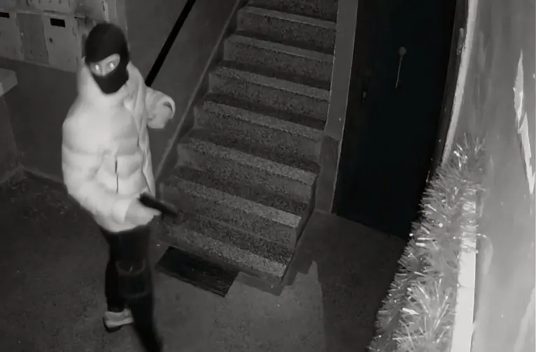 На видеото има момент, в който се чупи камера. Маскираните не са успели да разбият вратите долу.