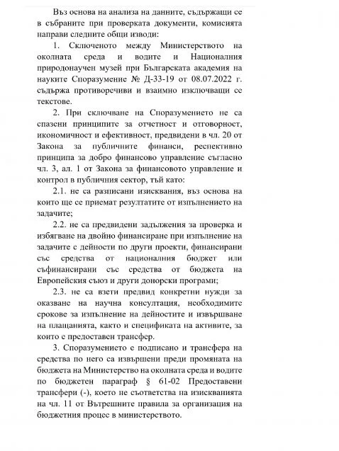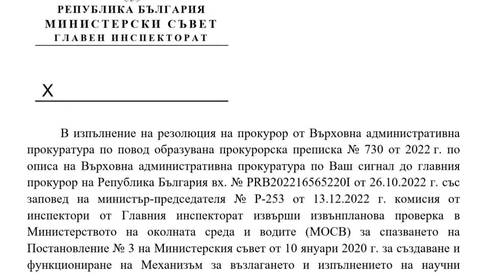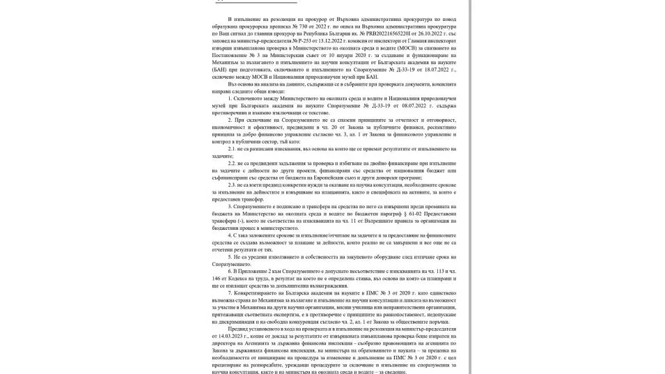 „Главния инспекторат извърши извънпланова проверка в Министерството на околната среда и водите (МОСВ) за спазването на Постановление № 3 на Министерския съвет от 10 януари 2020 г. за създаване и функциониране на Механизъм за възлагането и изпълнението на научни консултации от Българската академия на науките (БАН) при подготовката, сключването и изпълнението на Споразумение № Д-33-19 от 18.07.2022 г., сключено между МОСВ и Националния природонаучен музей при БАН“ става ясно от документите.