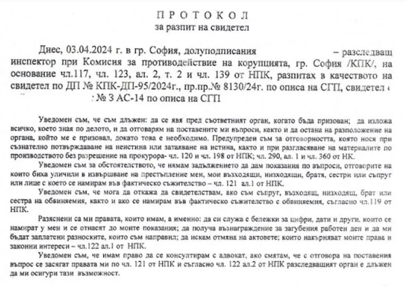 Към „Епицентър“ бе лийкнат протокол от разпит на „свидетел №3“, даден в присъствието на адвокат в сградата на КПК в следобедните часове миналата сряда.