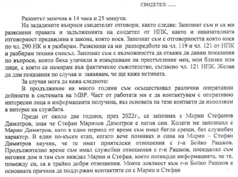 "В един по-късен етап, когато вече познавах и сина на Мартин - Стефан Димитров научих, че те имат приятелски отношения с г-н Бойко Рашков Продължително време съм имал служебни отношения с г-н Рашков, посещавал съм неговия дом и там съм виждал Марин и Стефан“.